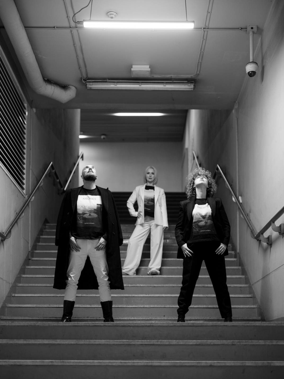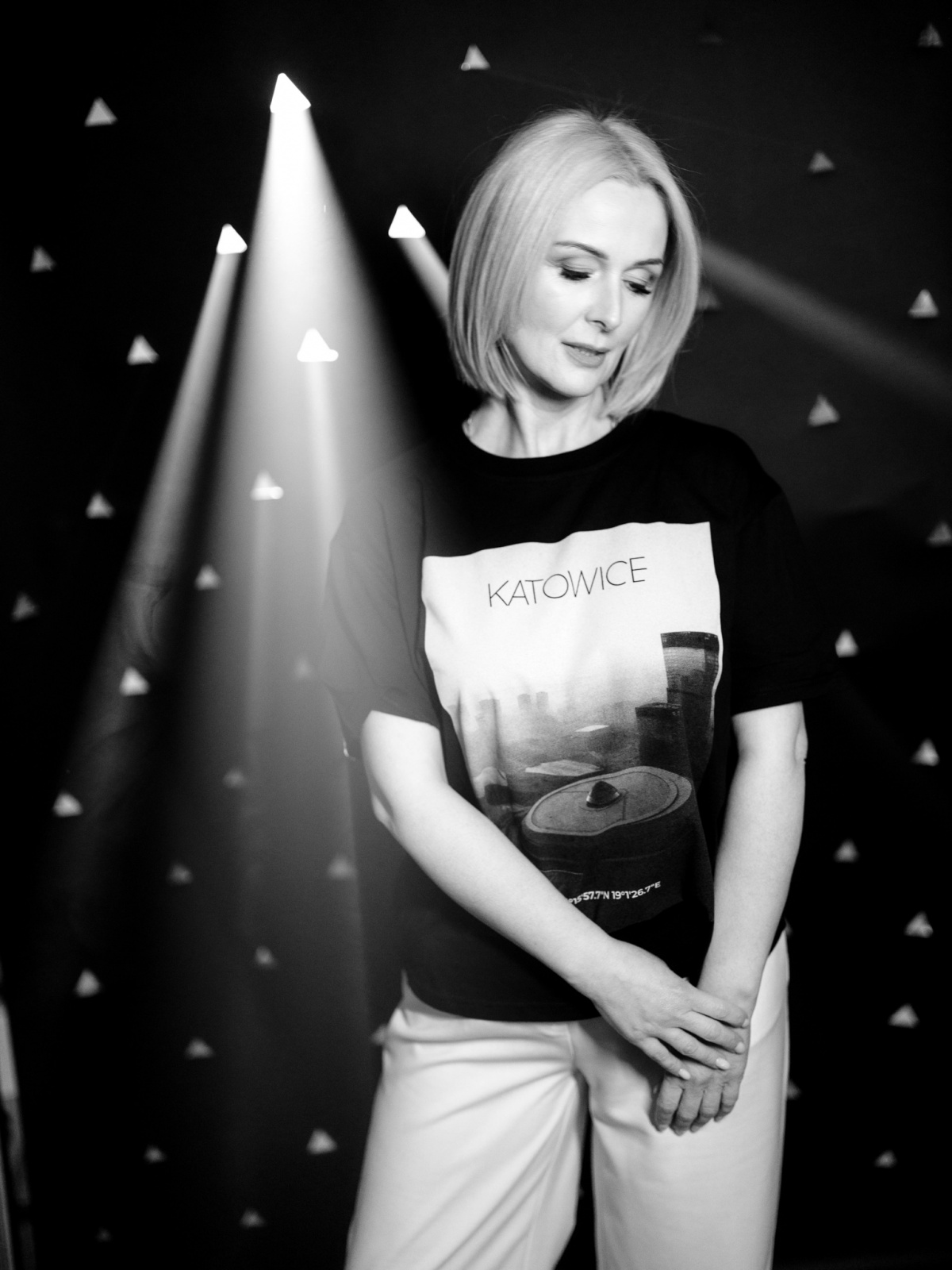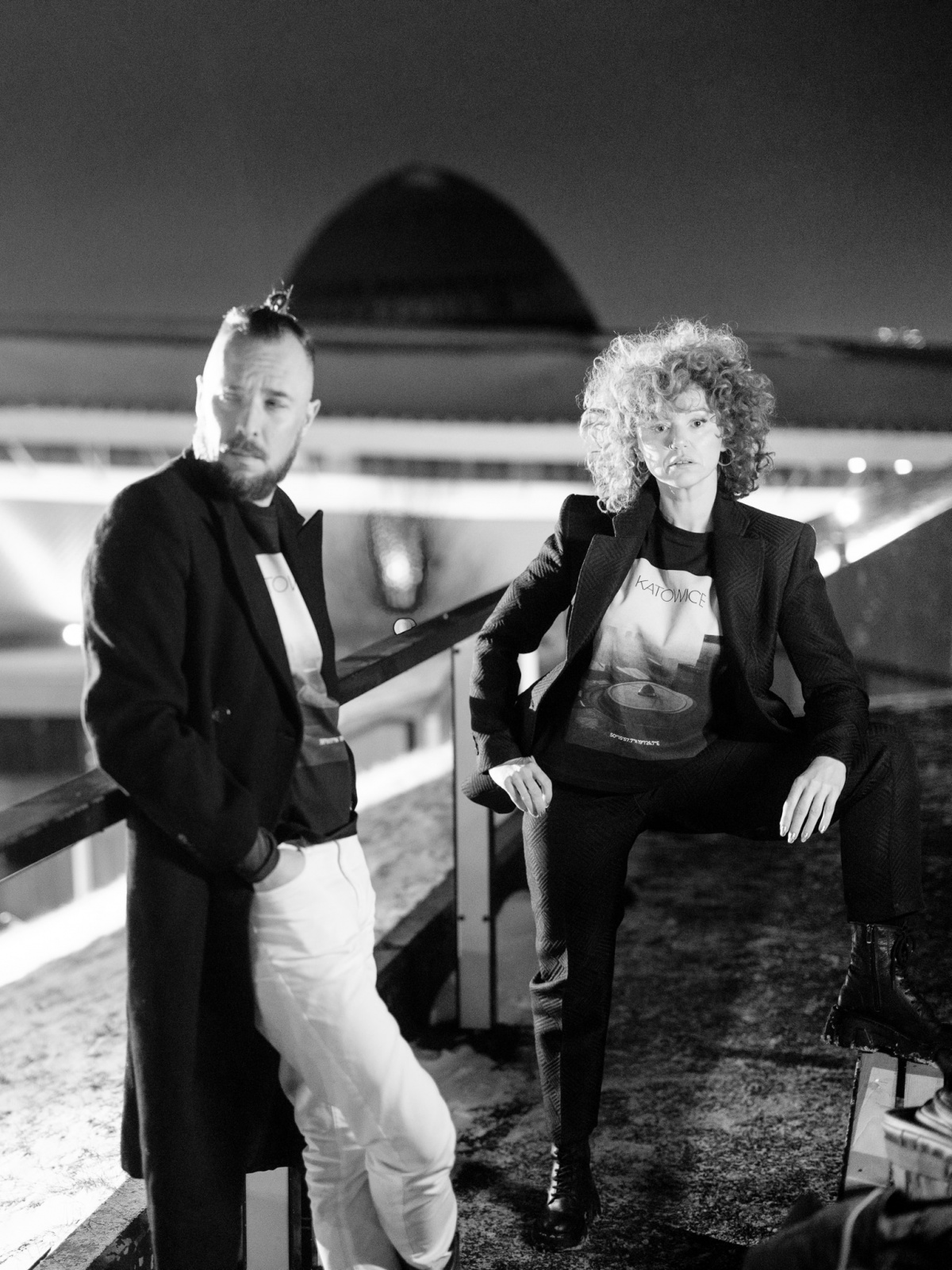 Dlo wszyjstkich, kierzy przajom gryfnyj katowickij architekturze. Na czorno-biołym łobrozku treficie Spodek, KTW, NOSPR i Gwiozdy.
