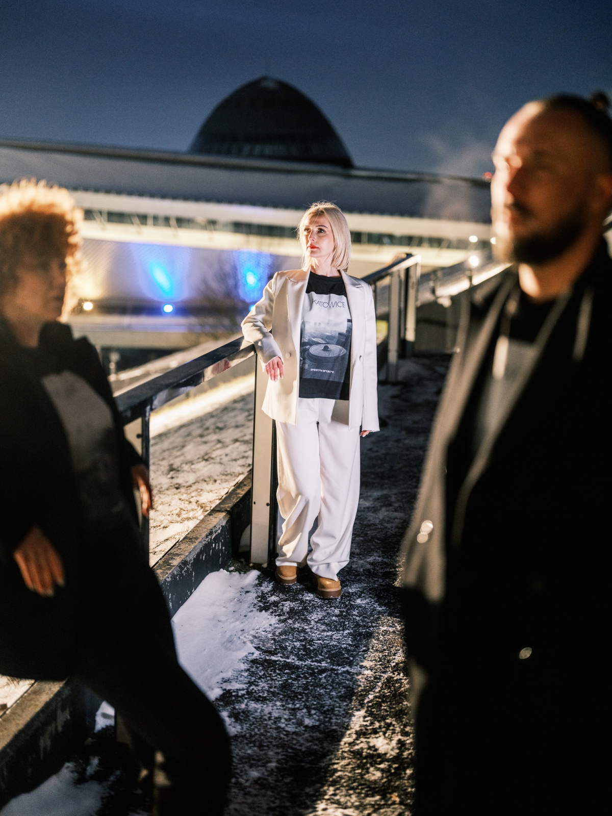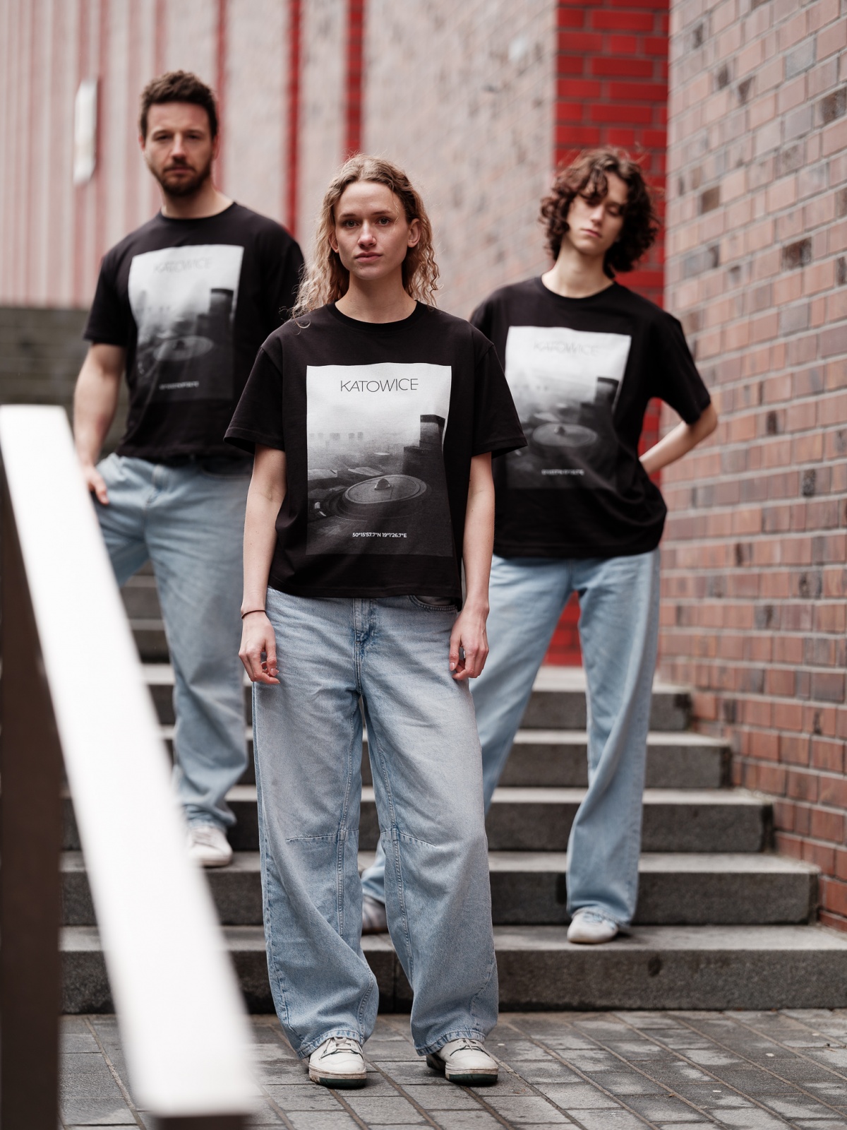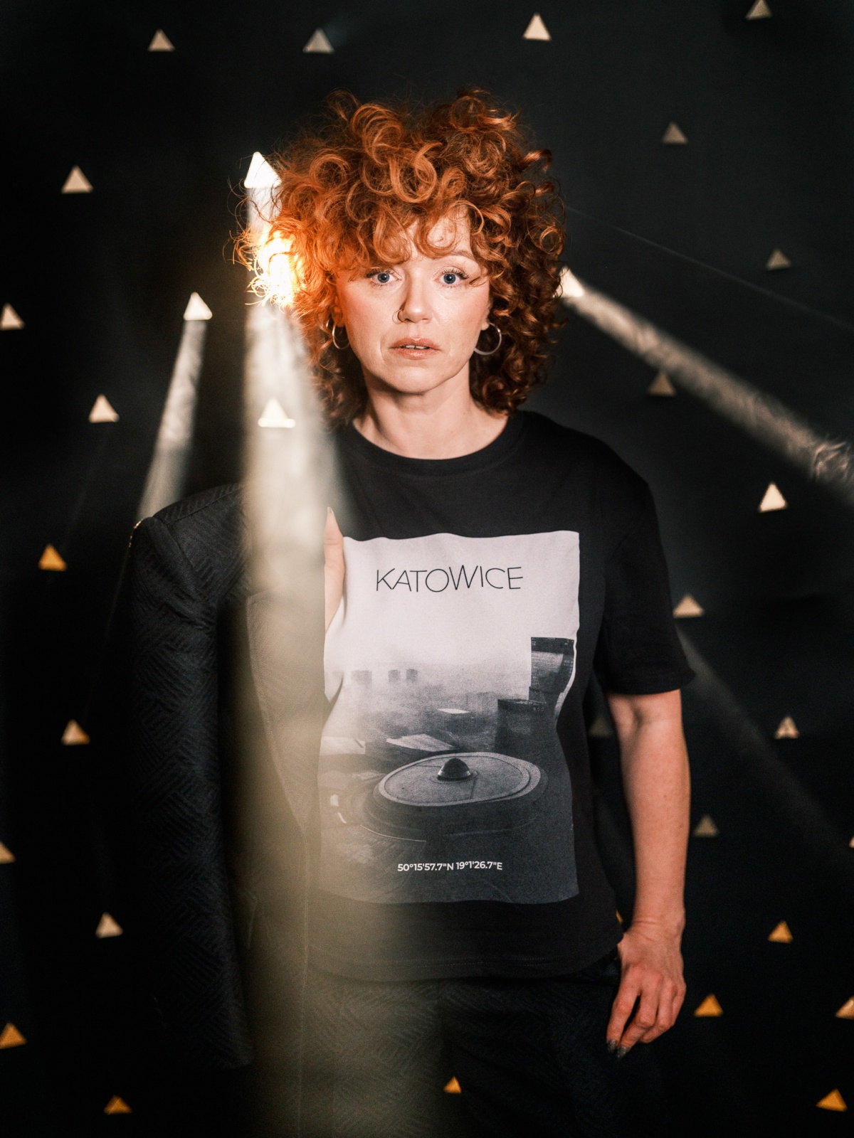 Dlo wszyjstkich, kierzy przajom gryfnyj katowickij architekturze. Na czorno-biołym łobrozku treficie Spodek, KTW, NOSPR i Gwiozdy.