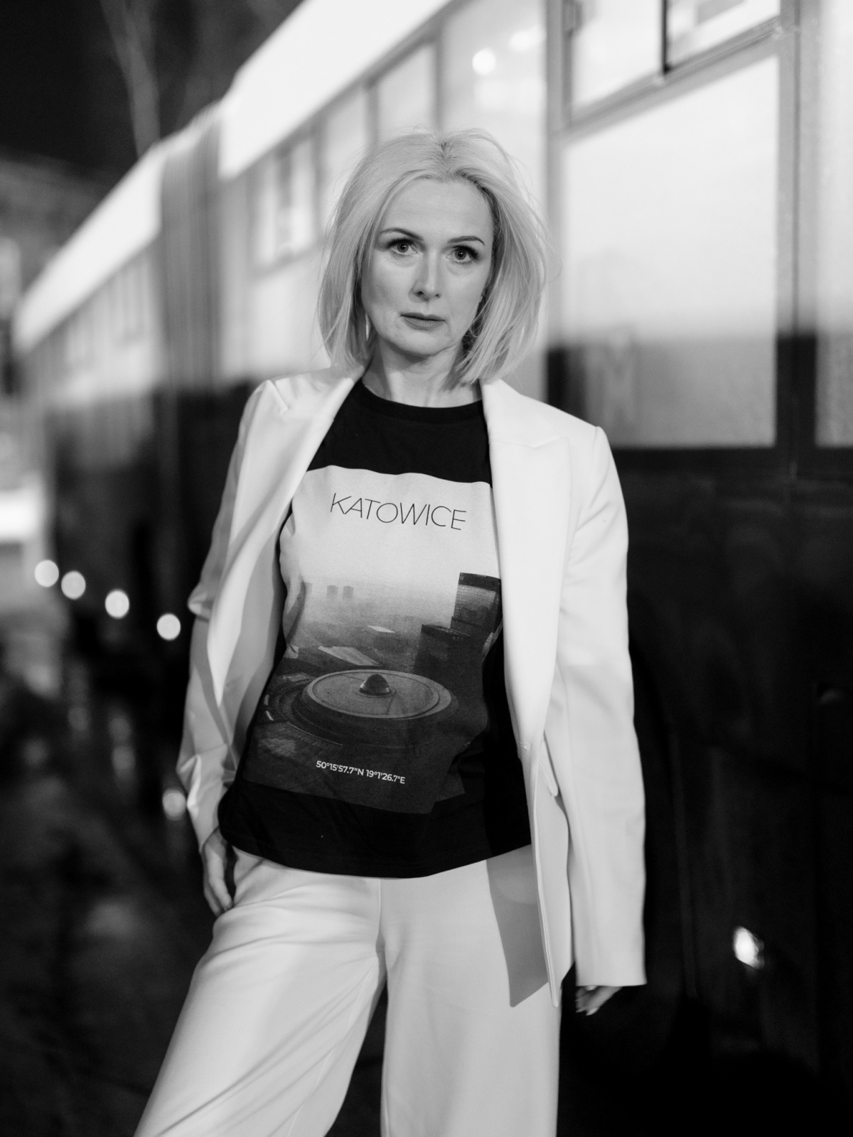 Limitowano (ino 200 sztuk) koszulka ze krótkim rynkowkiem na kieryj treficie czorno-bioły łobrozek z Katowic łod Szymona Króla.
