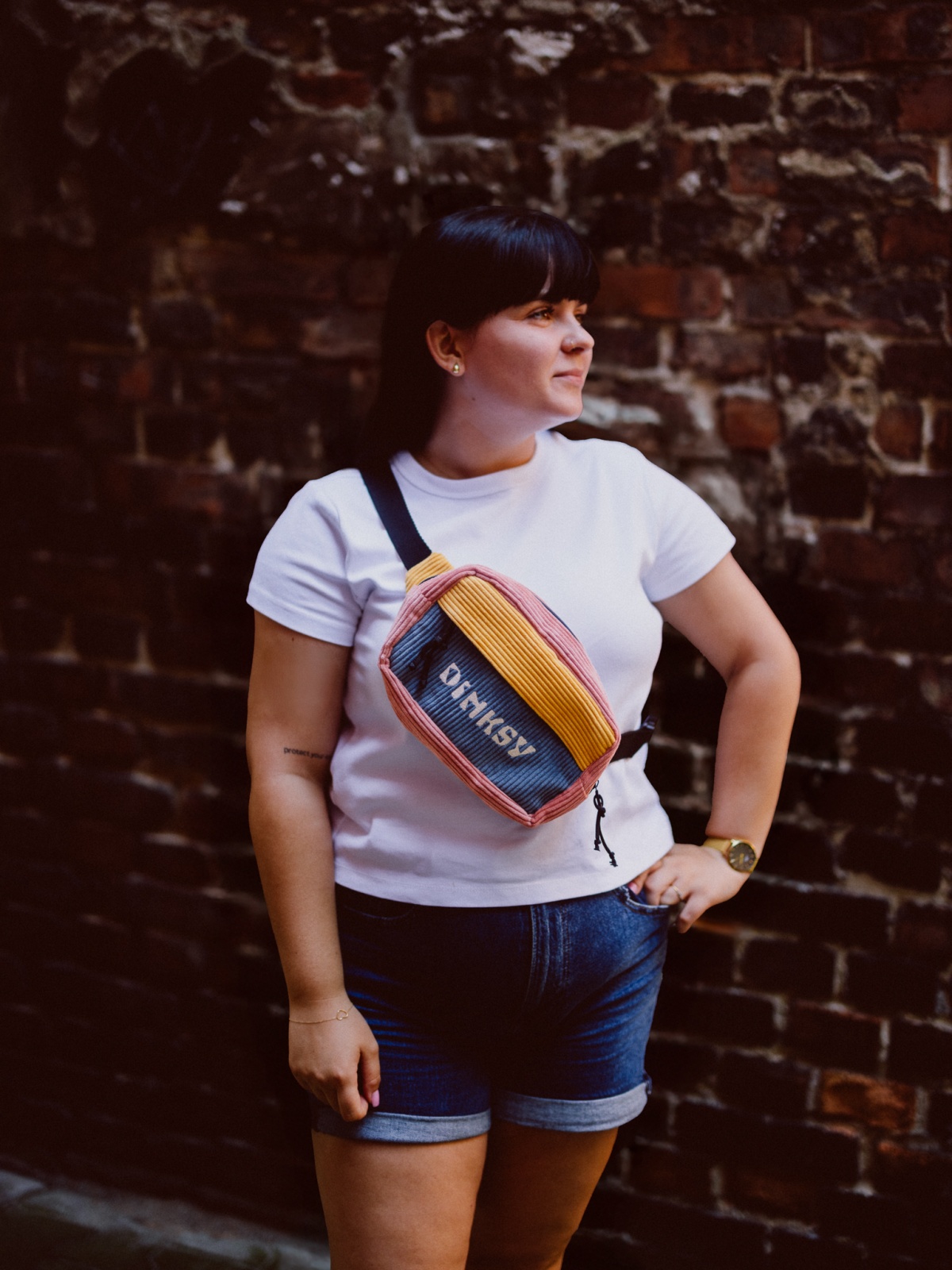Z przodku komora zapinano na rajfynszlos, pojszczodku dodatakowo wywnytrzno kapska na roztomajte klamoty, tyż zapinano na rajfynszlos. Haftowany napis "Dinksy" i naszywka skórkowo "Gryfnie".