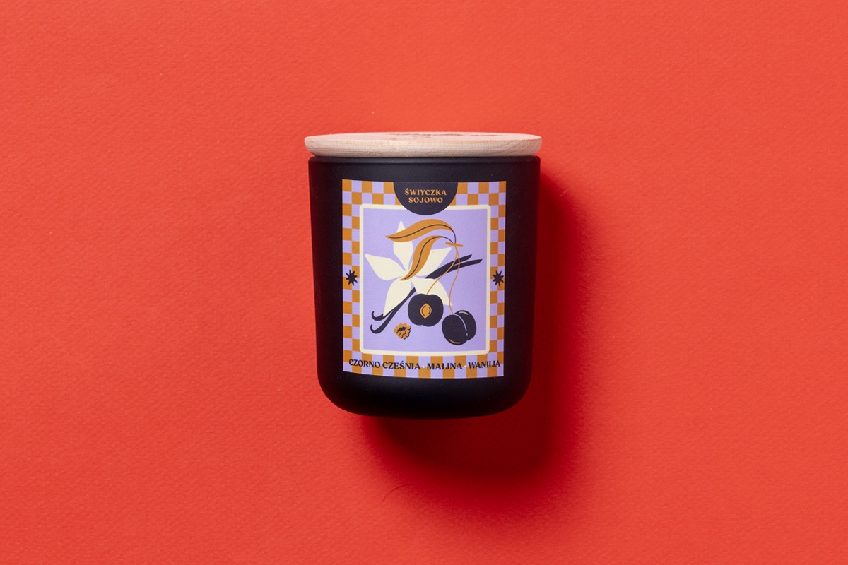 Sprzedowane we gryfnyj czornyj krauzce, ze drzewianym deklem. 170g wosku sojowego.